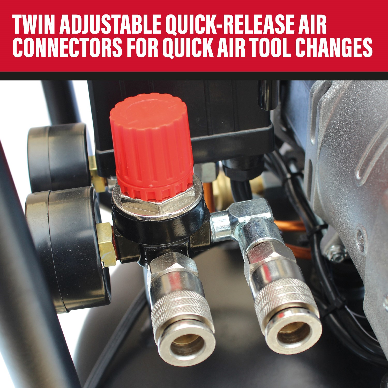 Operating at a low 67dB, it’s ideal for work areas where maintaining a low noise level is a consideration. This oil-free and low maintenance compressor delivers 13.6CFM piston displacement resulting in 9CFM Free Air Delivery (FAD) for a consistent air supply ideal for inflation tasks, nailing, stapling and airbrushing.