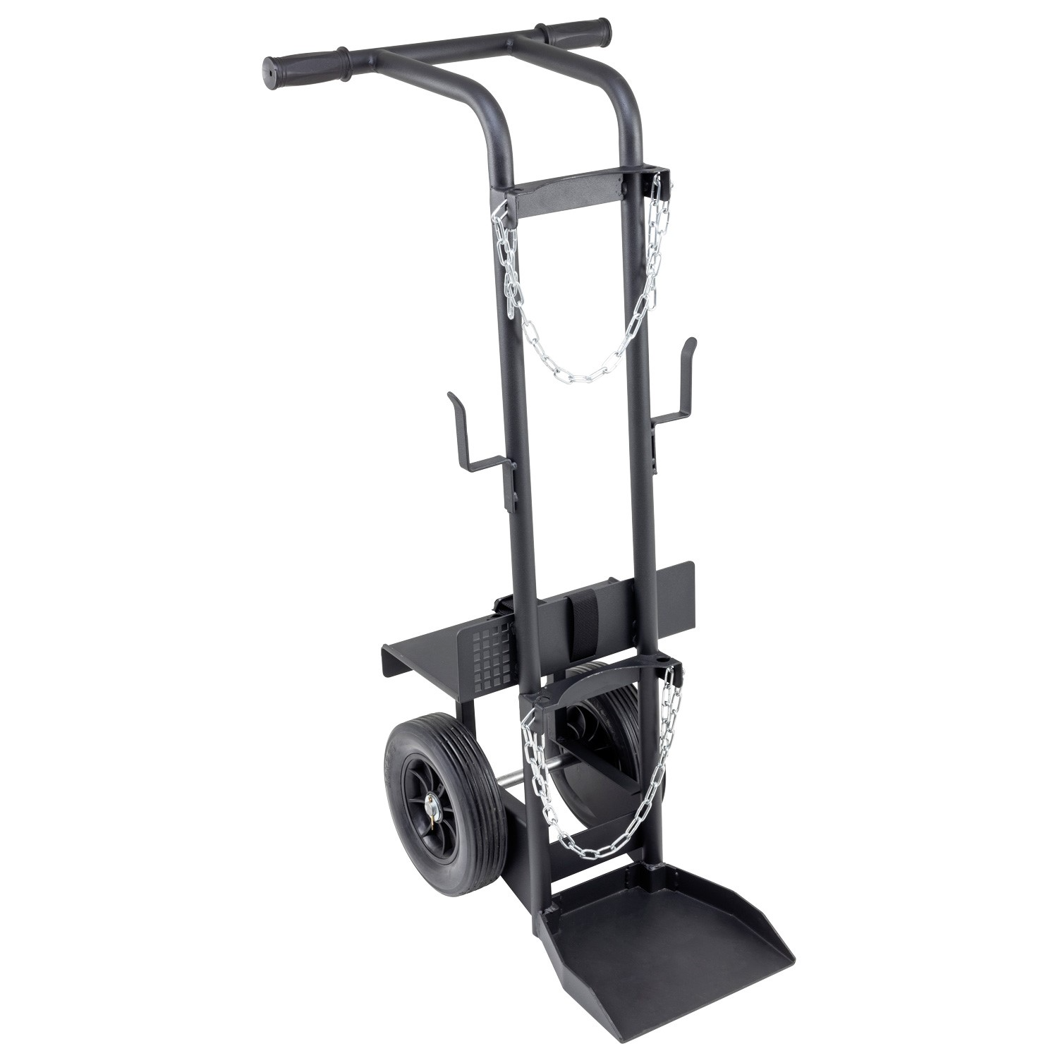 Cylinders can be secured at two points on the trolley via pull-through chains, while large solid wheels ensure great mobility for use in workshops and other environments.